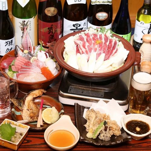 名車平名物【鴨鍋】、季節ごとの旬の【お刺身盛り】など、自信を持ってお出しさせていただく、お料理内容です。飲み放題は2時間です。また、ご予算等に応じてお料理内容を変更することも可能ですので、お気軽にご相談・お問い合わせください。※写真はベースの5000円(税込)コースのイメージです。